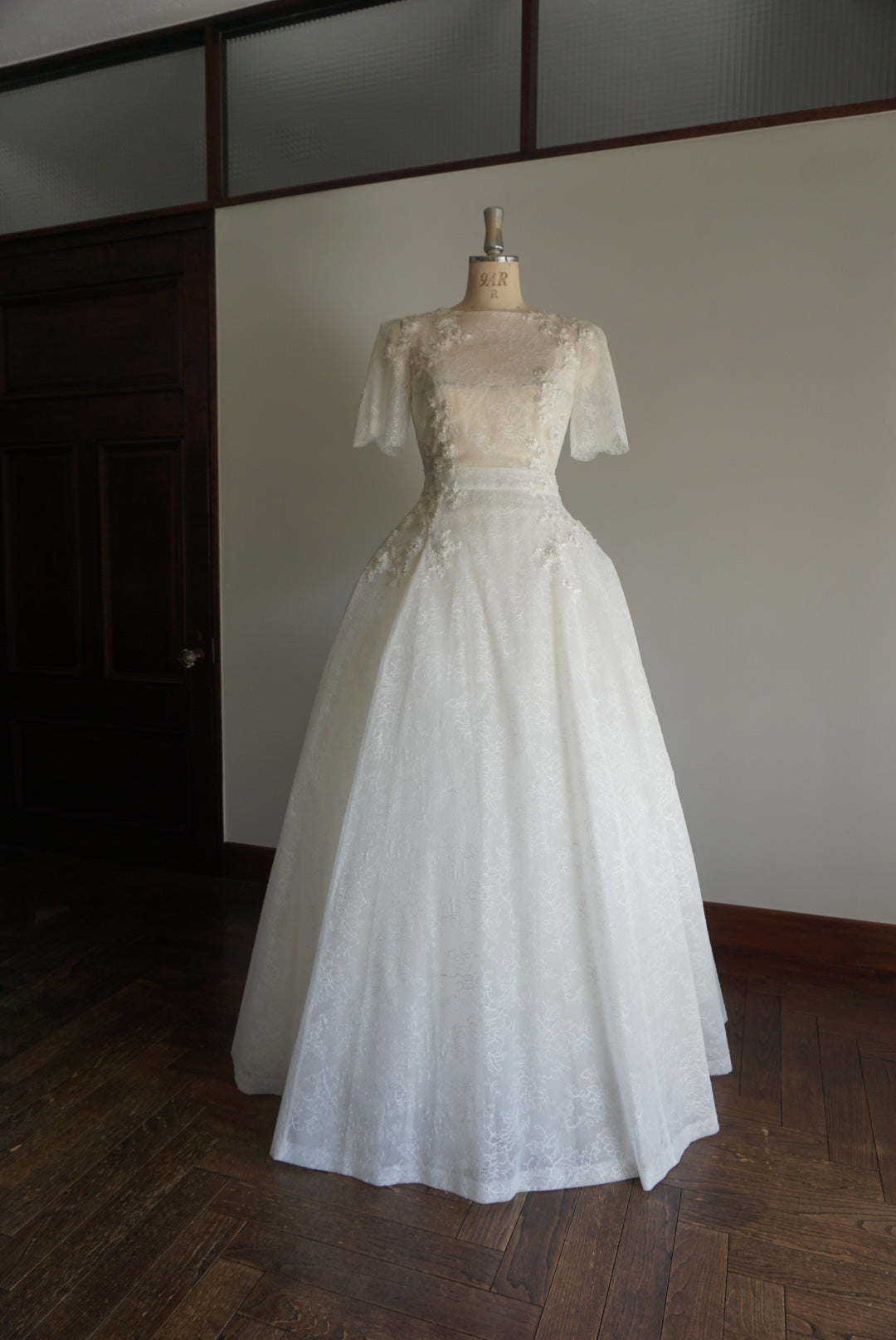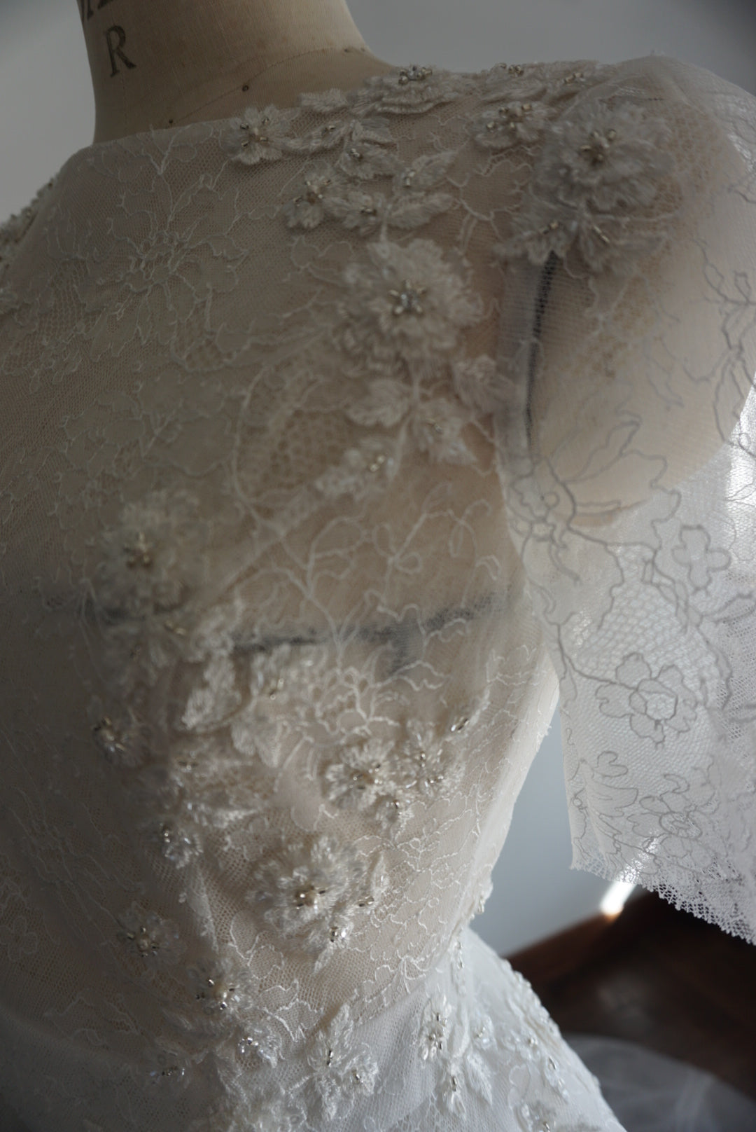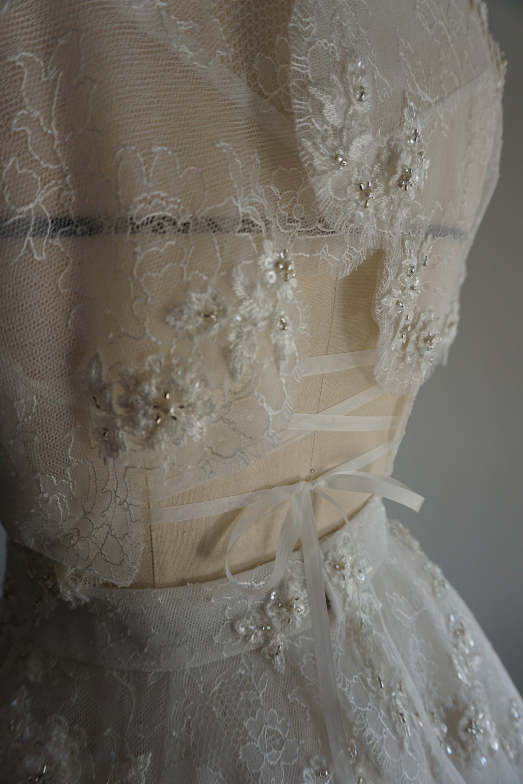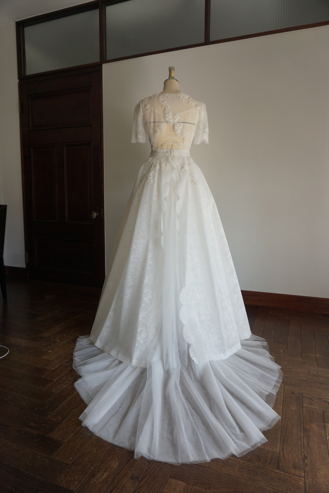 This gorgeous overdress piece is fitted with a voluminous panniers with a long train underneath, and is studded with beaded embroidered motifs here and there.