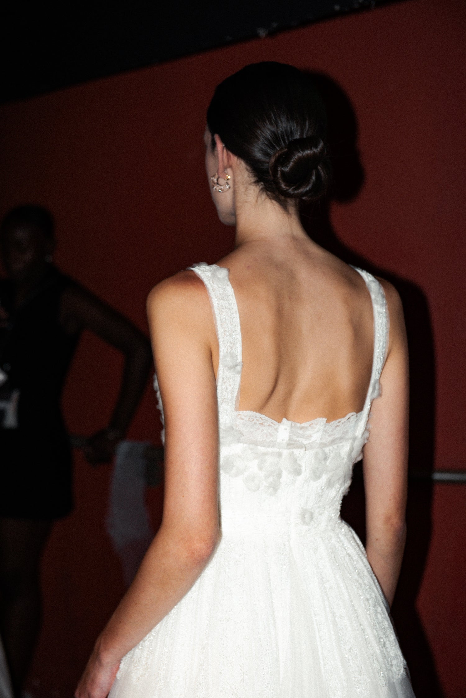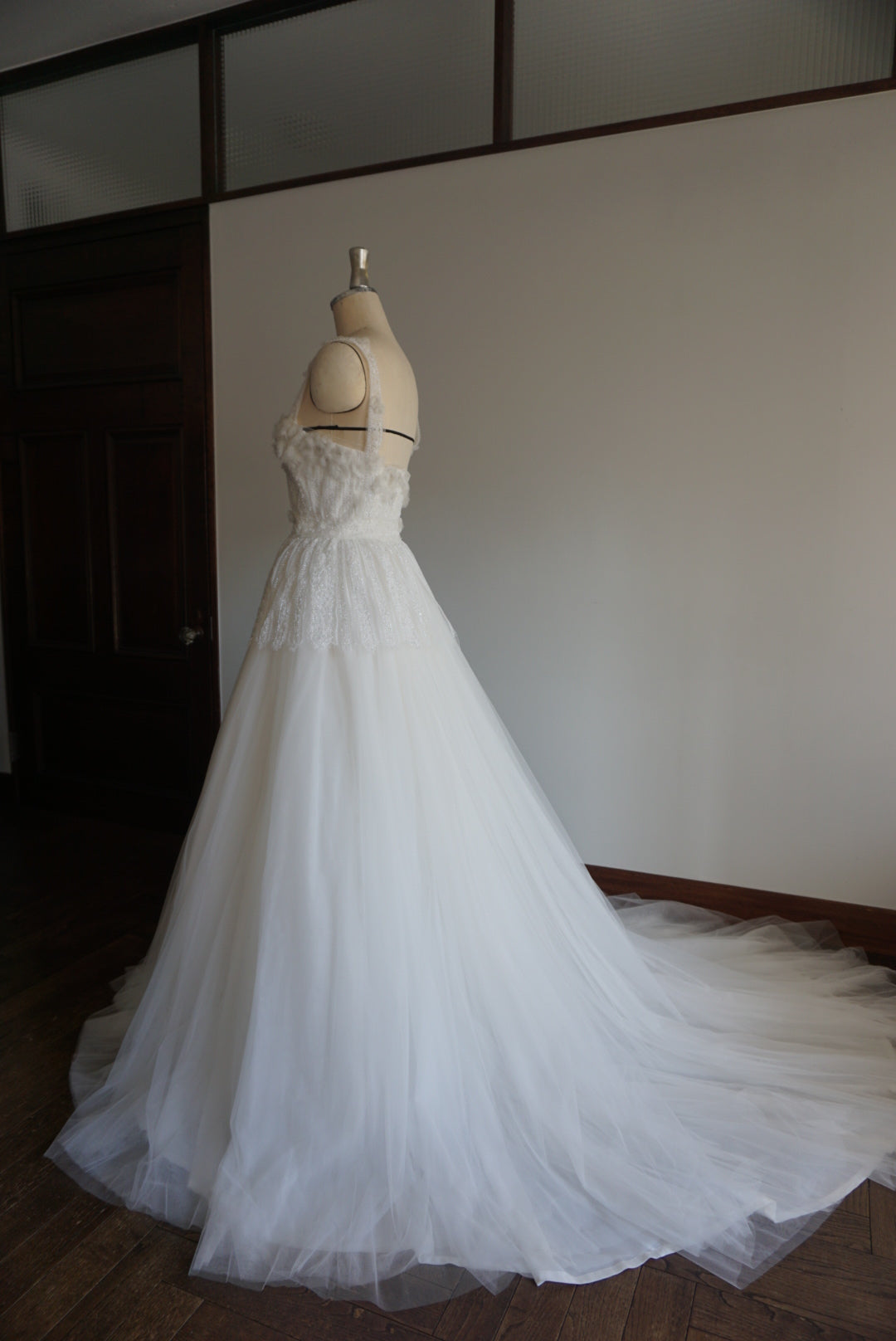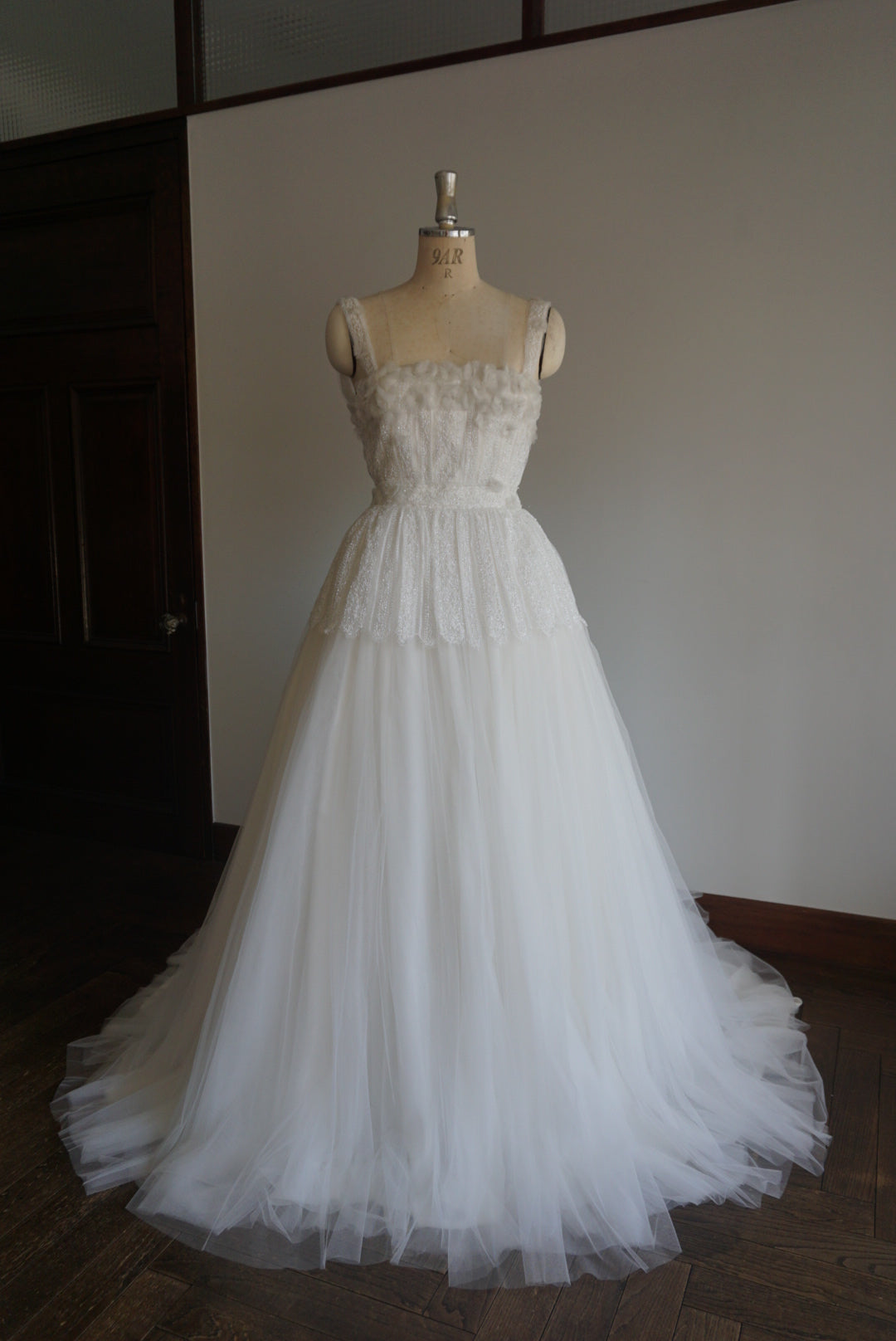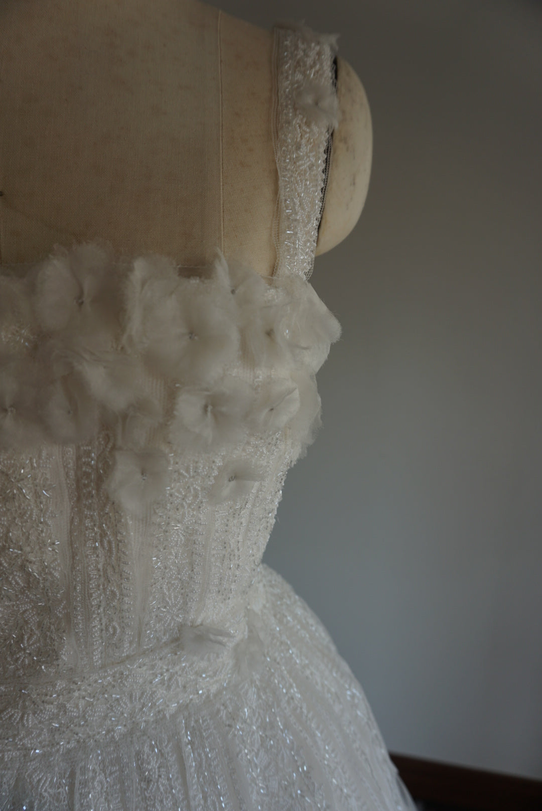 The chest area is made of silk organza and is decorated with layered floral motifs.