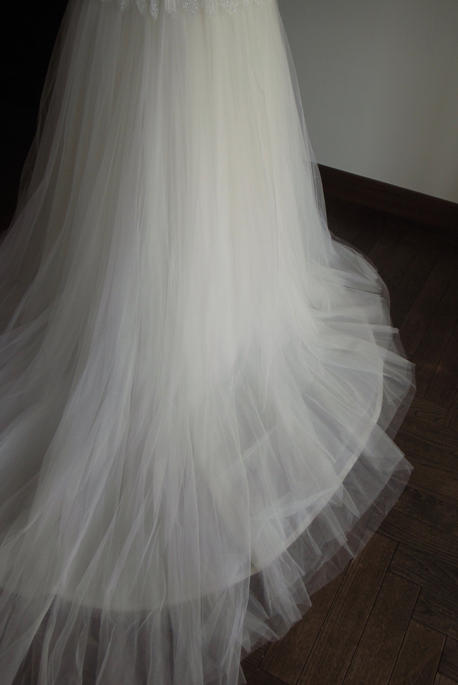 The tulle is also layered in multiple layers to create a voluminous dress.