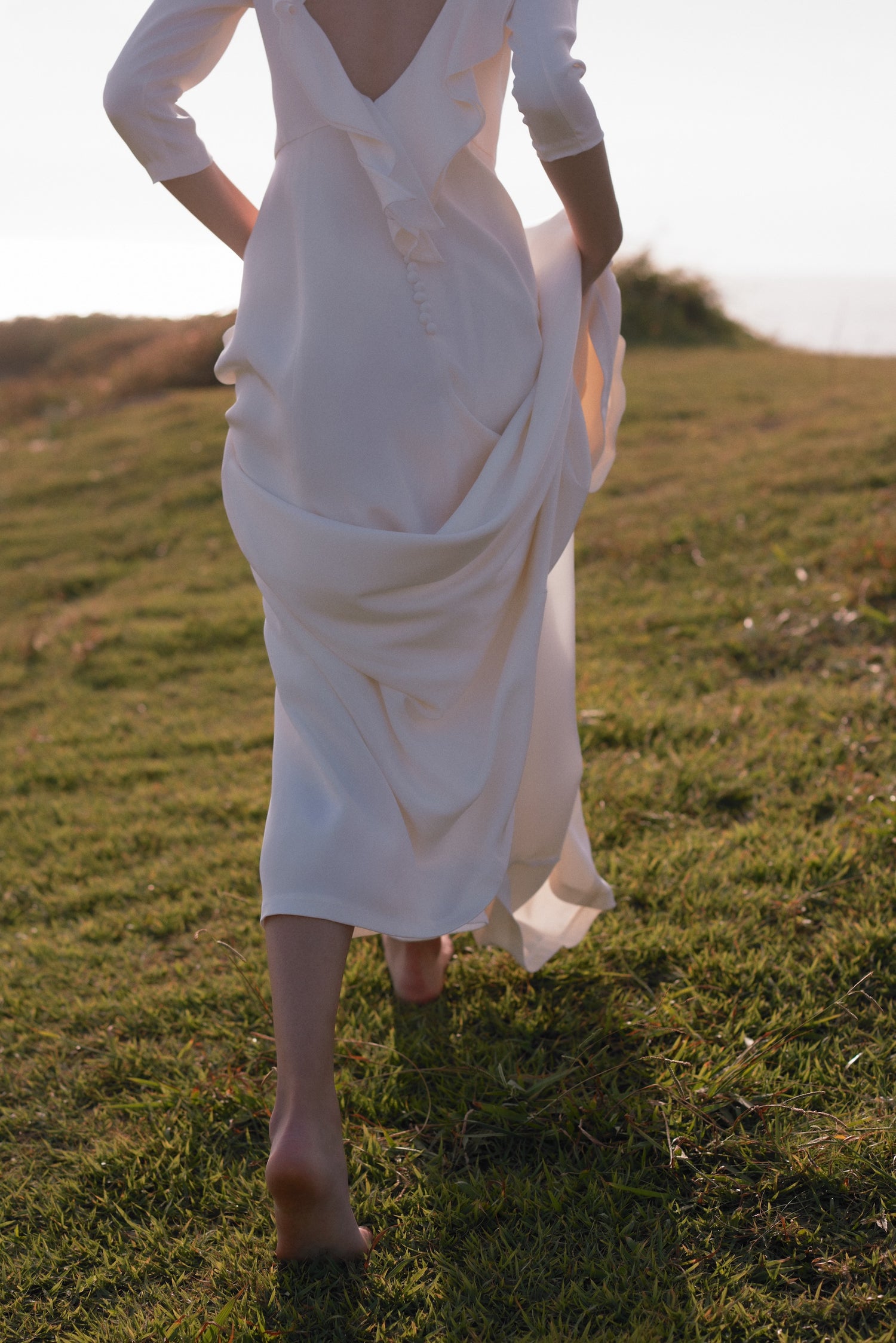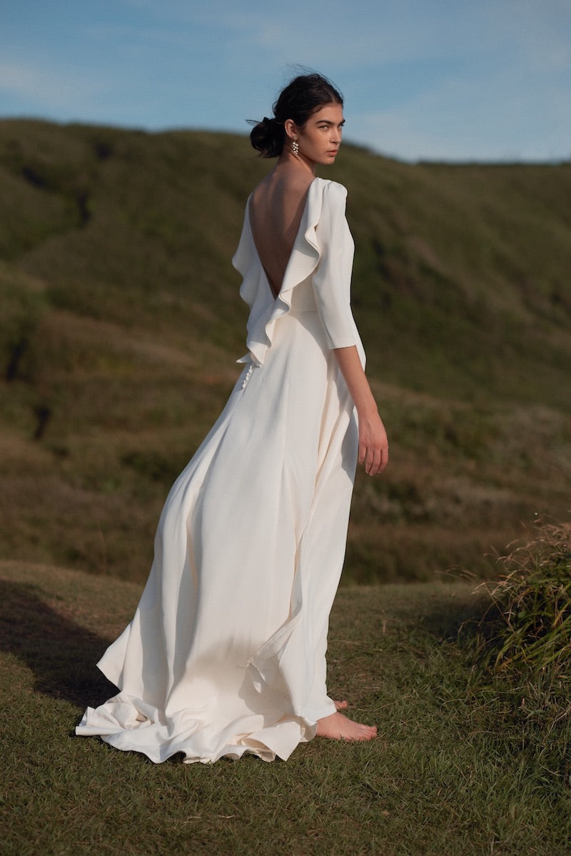 バックスタイルの大きなフリルは、風によってもたらされた湖の波をイメージしています。 静かに広がる湖に、時折穏やかな風が優しい波を運び、それとともにわたしたちに澄んだ空気を運んでくれます。