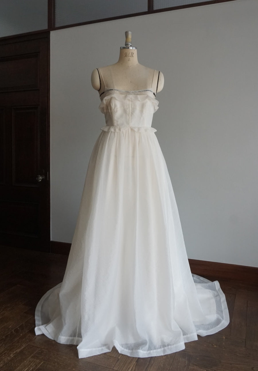 やわらかなフォギーオーガンジーと繊細なシャンティレースで仕立てた、淡い光に包まれるようなロマンティックドレス。