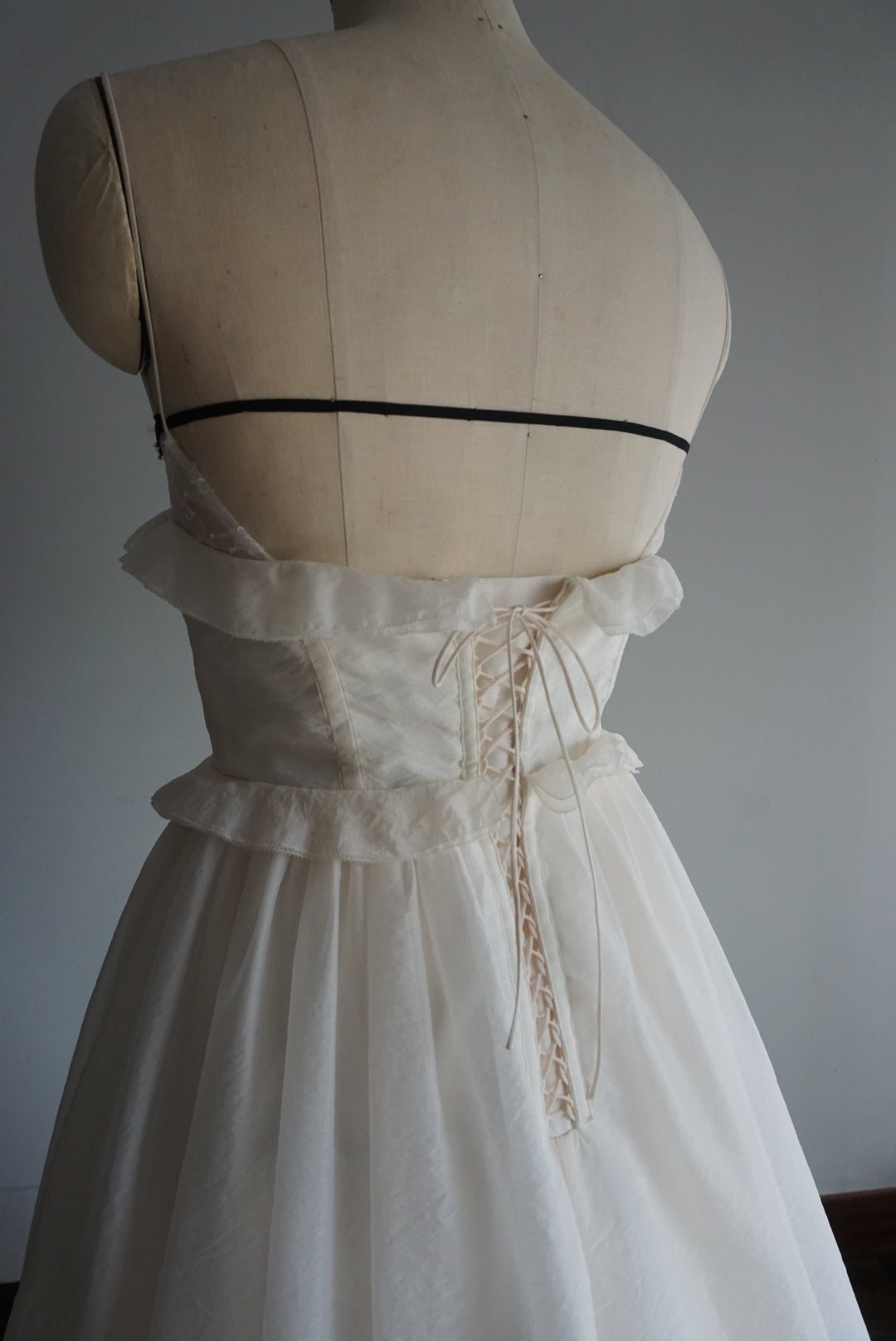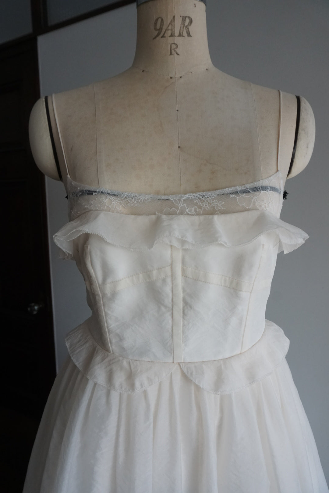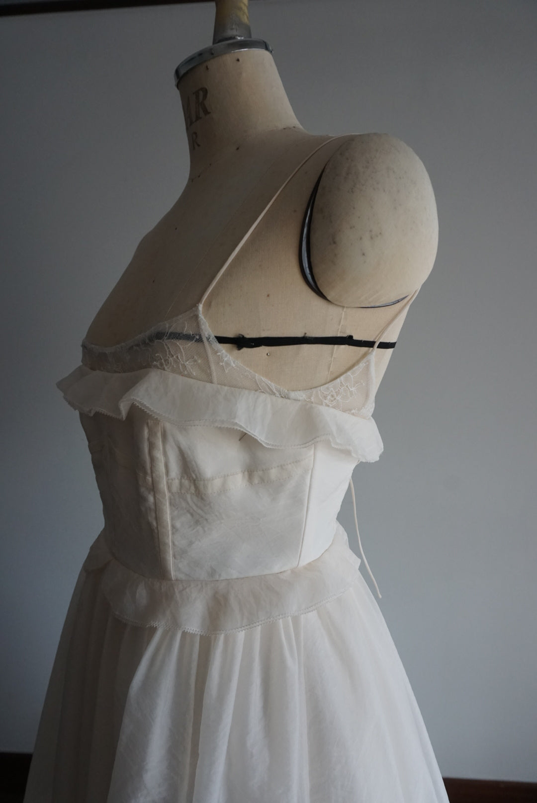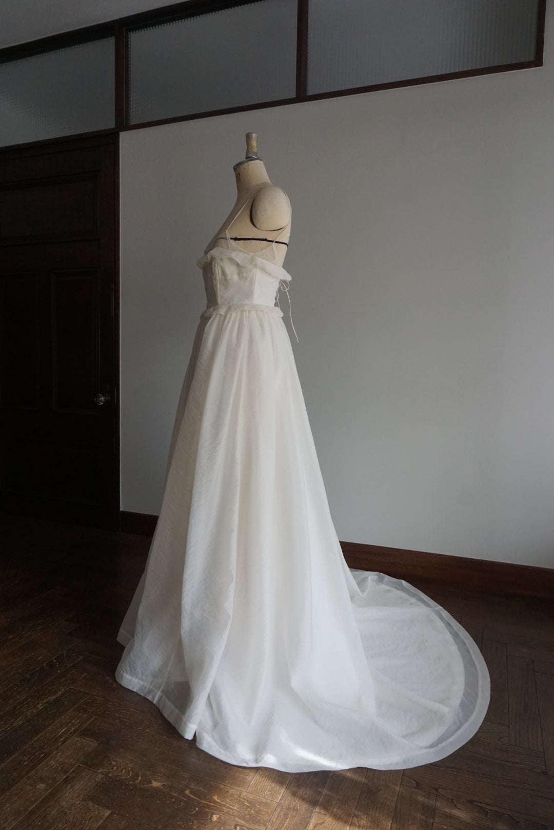 オーガンジーのほのかな透け感が肌に柔らかな光を宿し、フィットしたボディラインと背中のディテールが、静かな大人の気配を添えます。