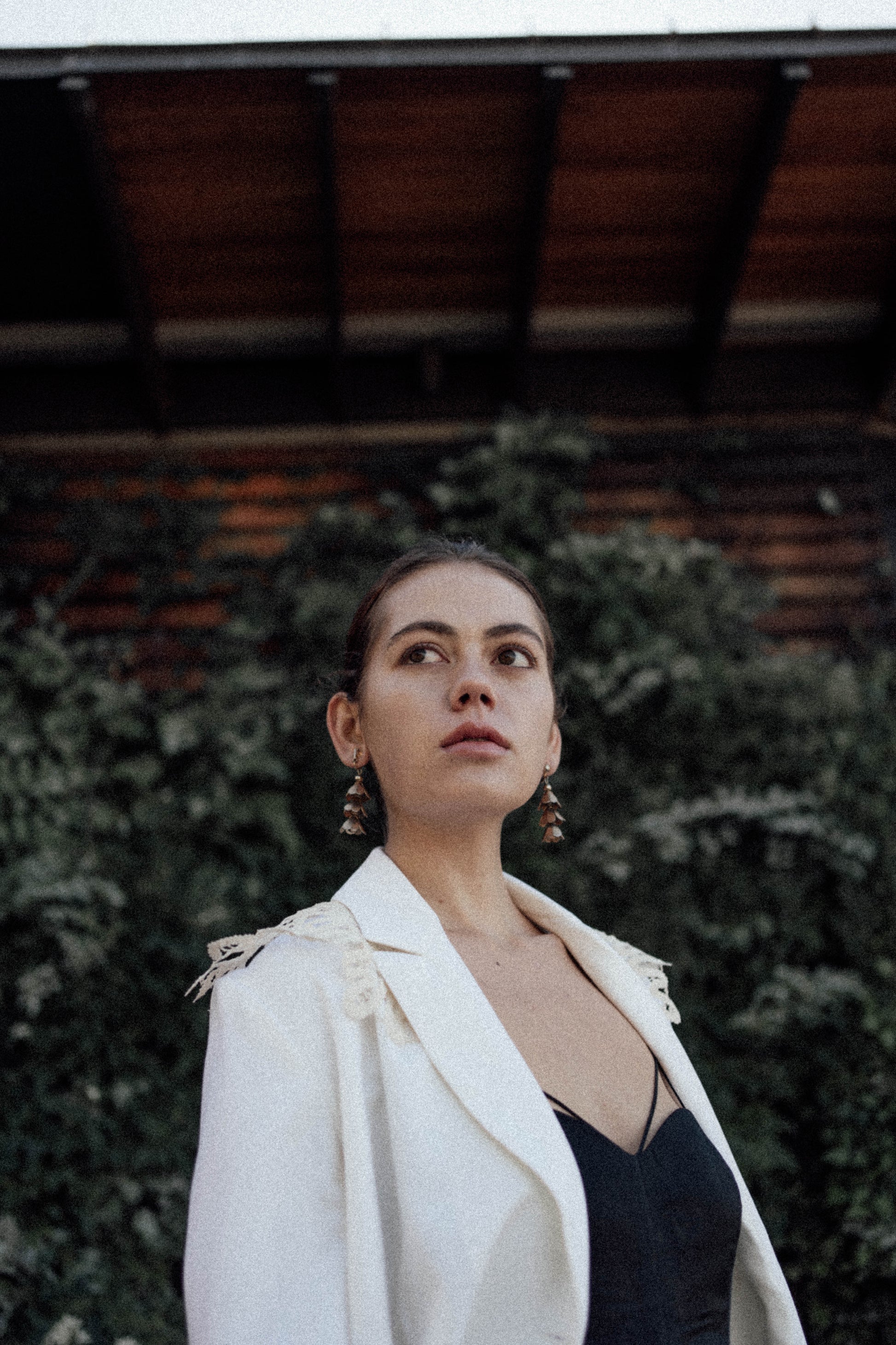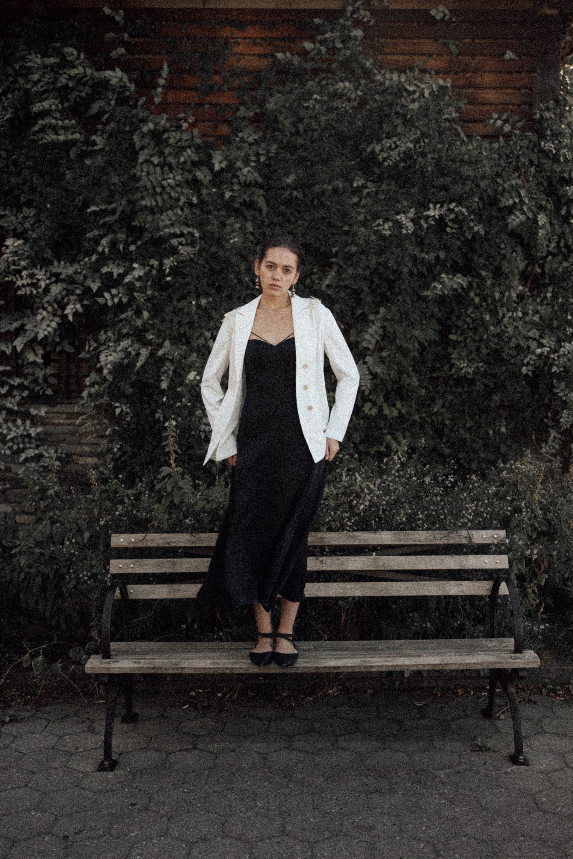 ボックスシルエットは、インナーに女性らしい曲線を描くドレスを合わせたイメージでデザインし、メンズライクになりすぎず、控えめな甘さを添えた佇まいを作ります。