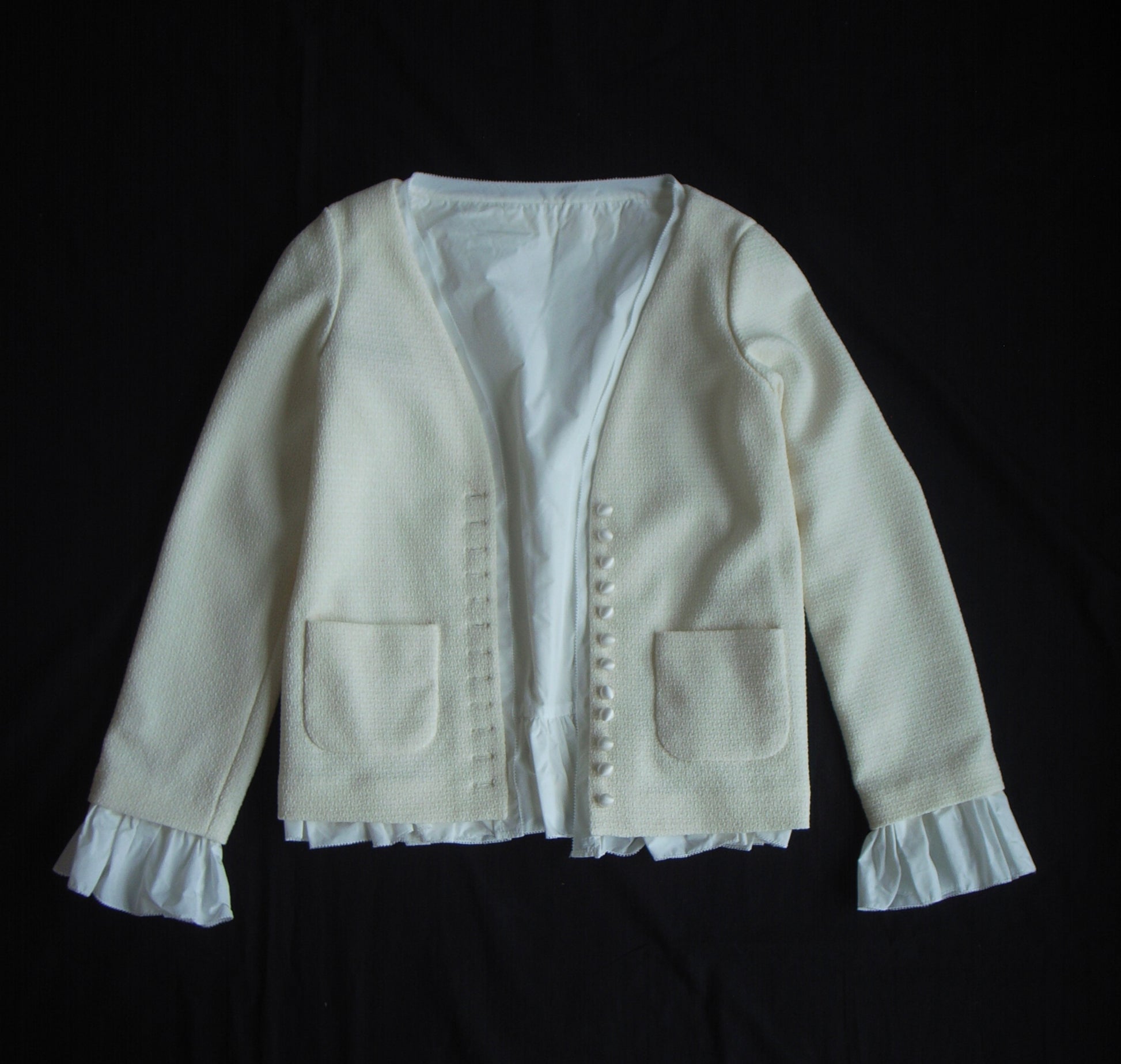 柔らかなファンシーツイードに、タフタのフリルを施し、フリル端にはピコ刺繍を添えました。