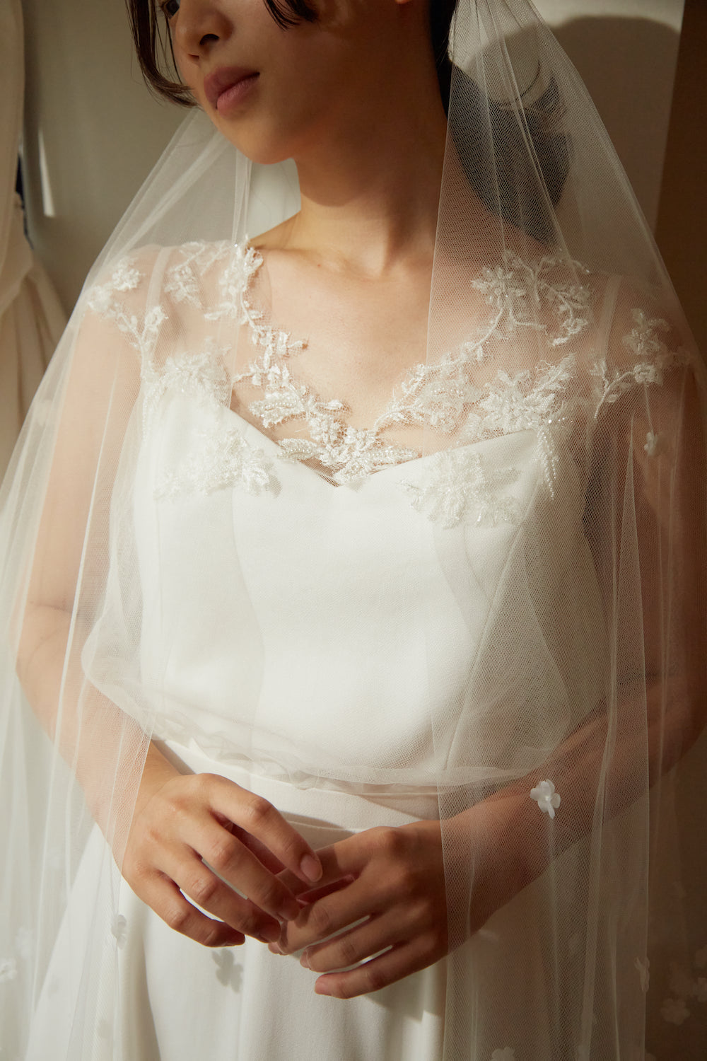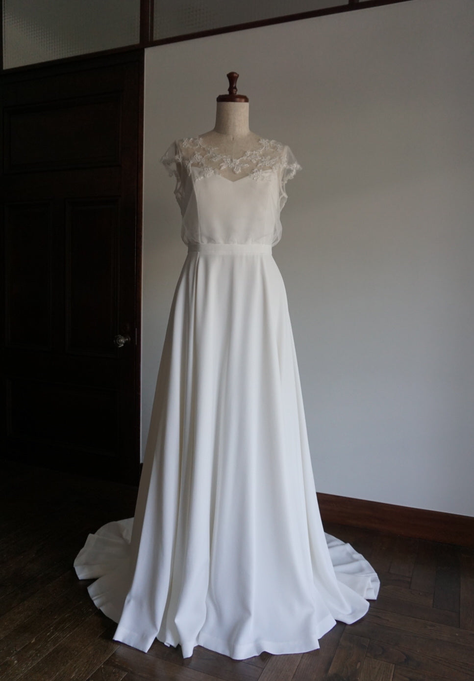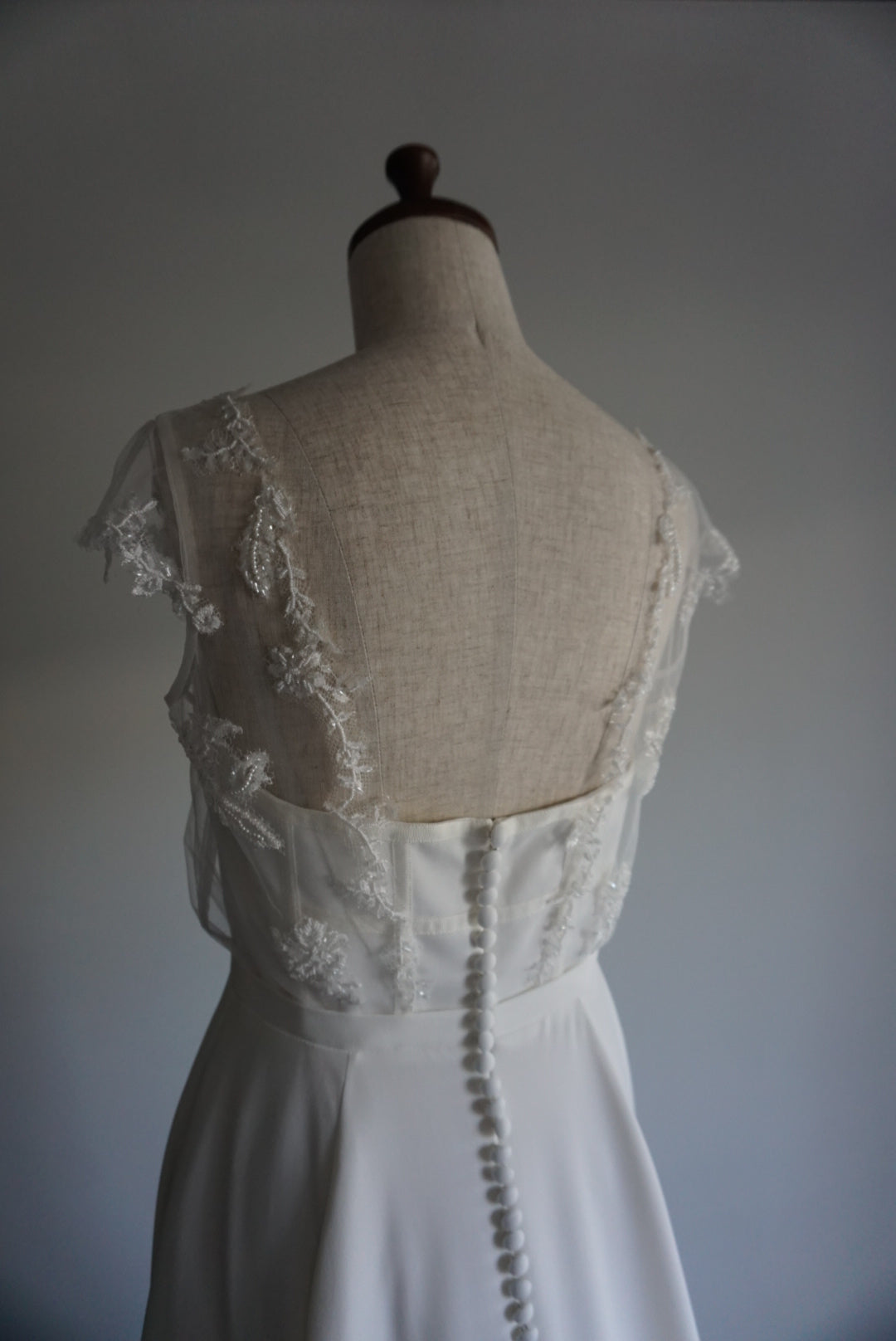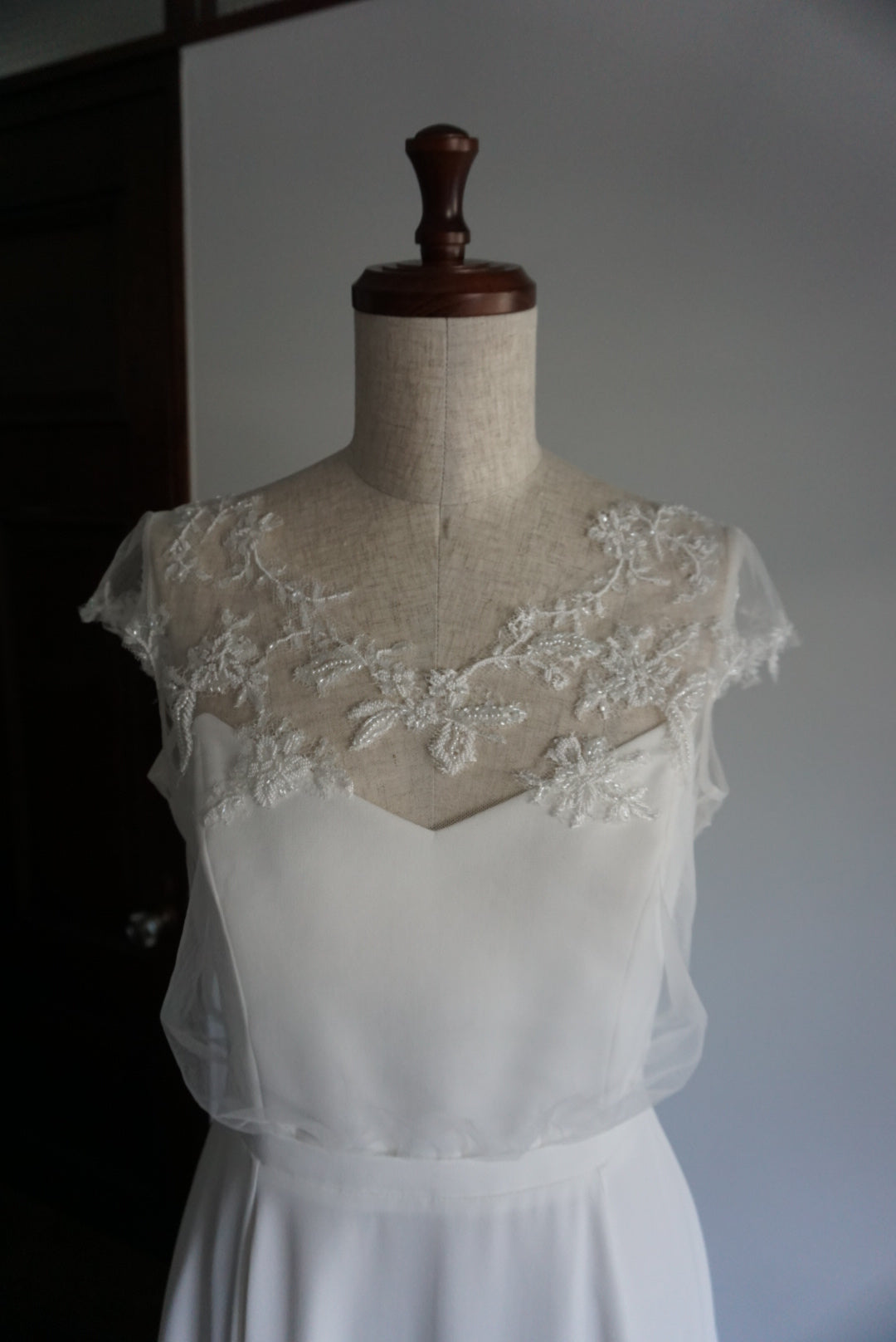 繊細なチュールの上に繊細なビーズワークのレースを施した上身。