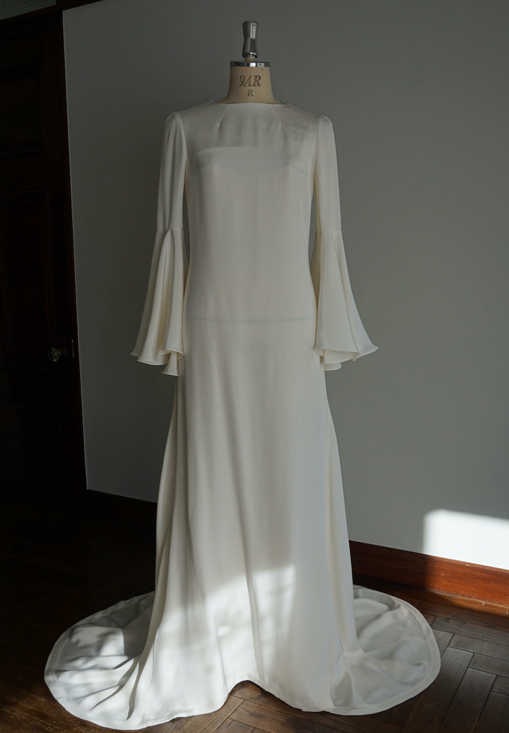 ストンとしたシルエットに大きくフレアの入るラッフルスリーブ。
