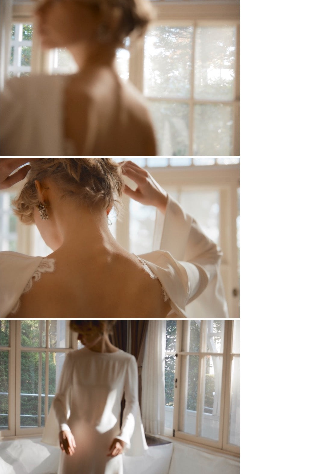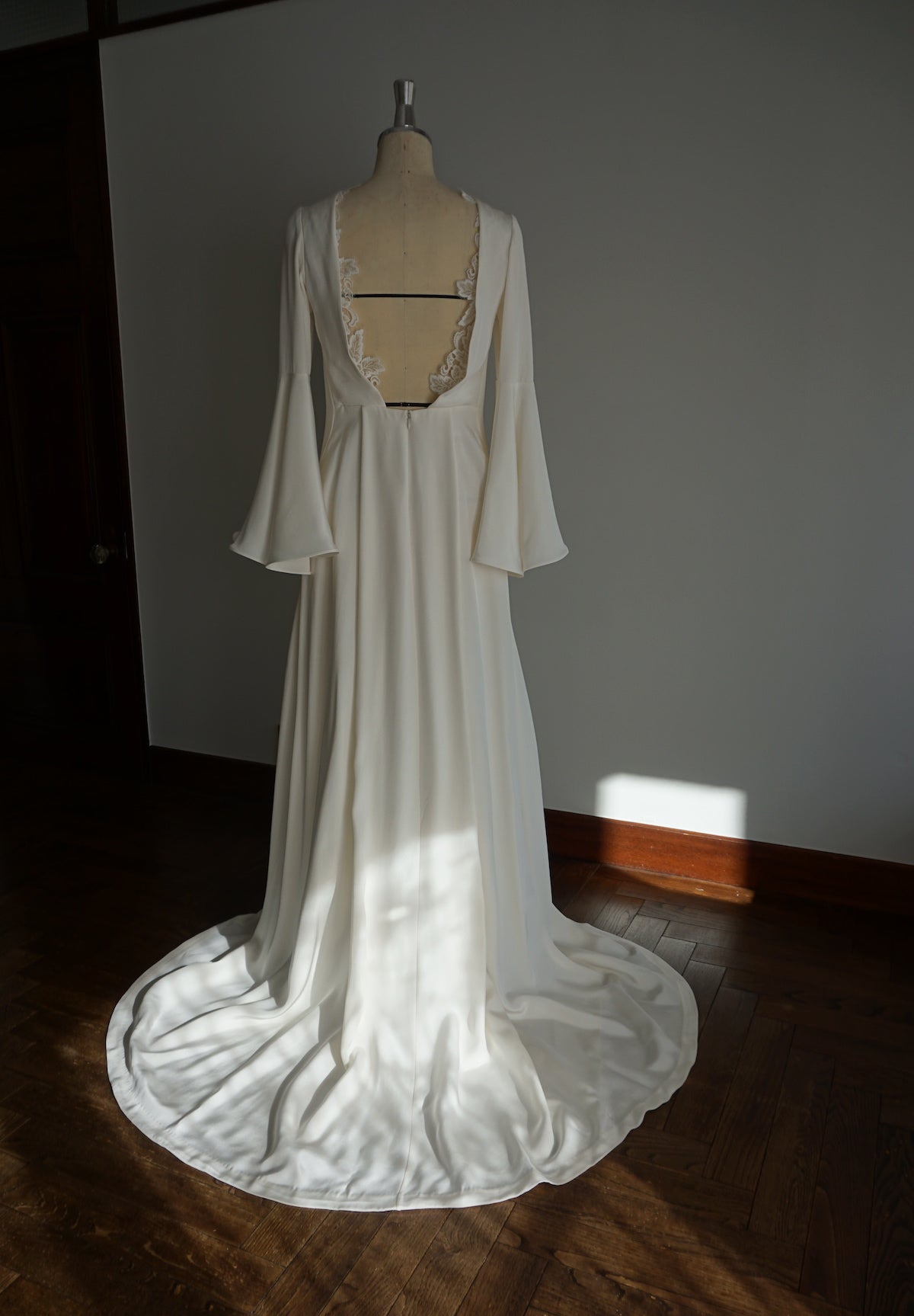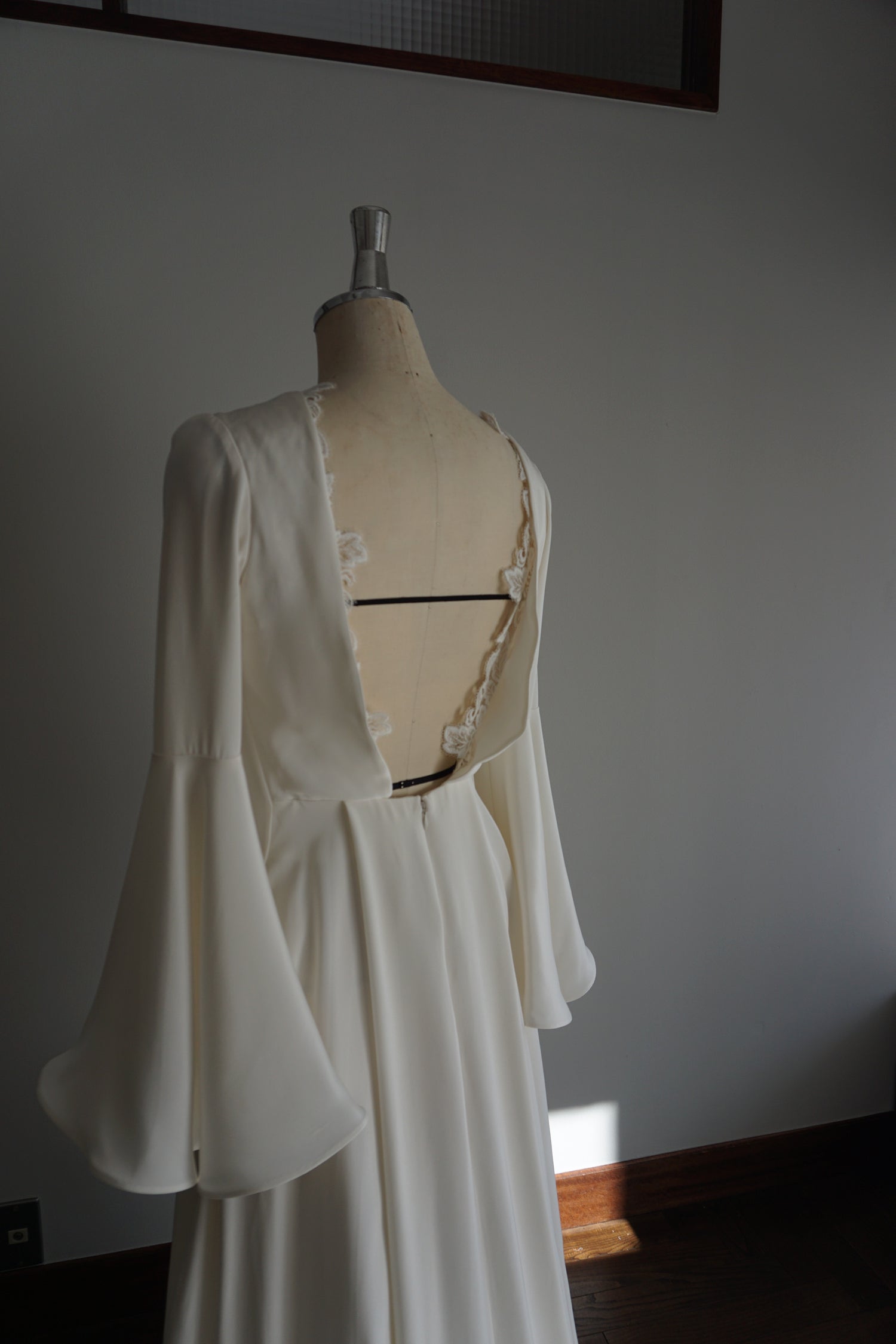 たゆたうカーテンをイメージしたお背中にはそっとレースを添えています。