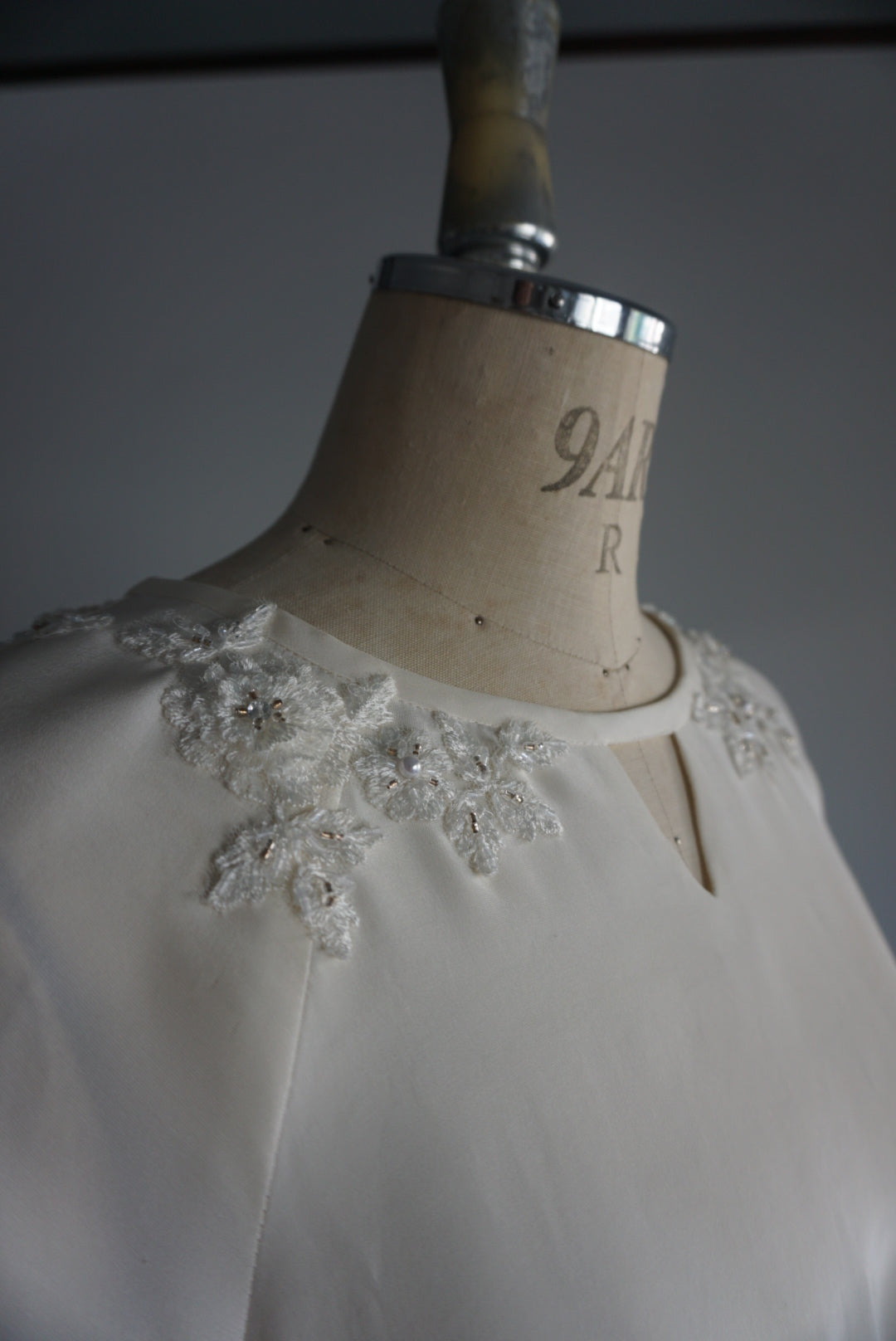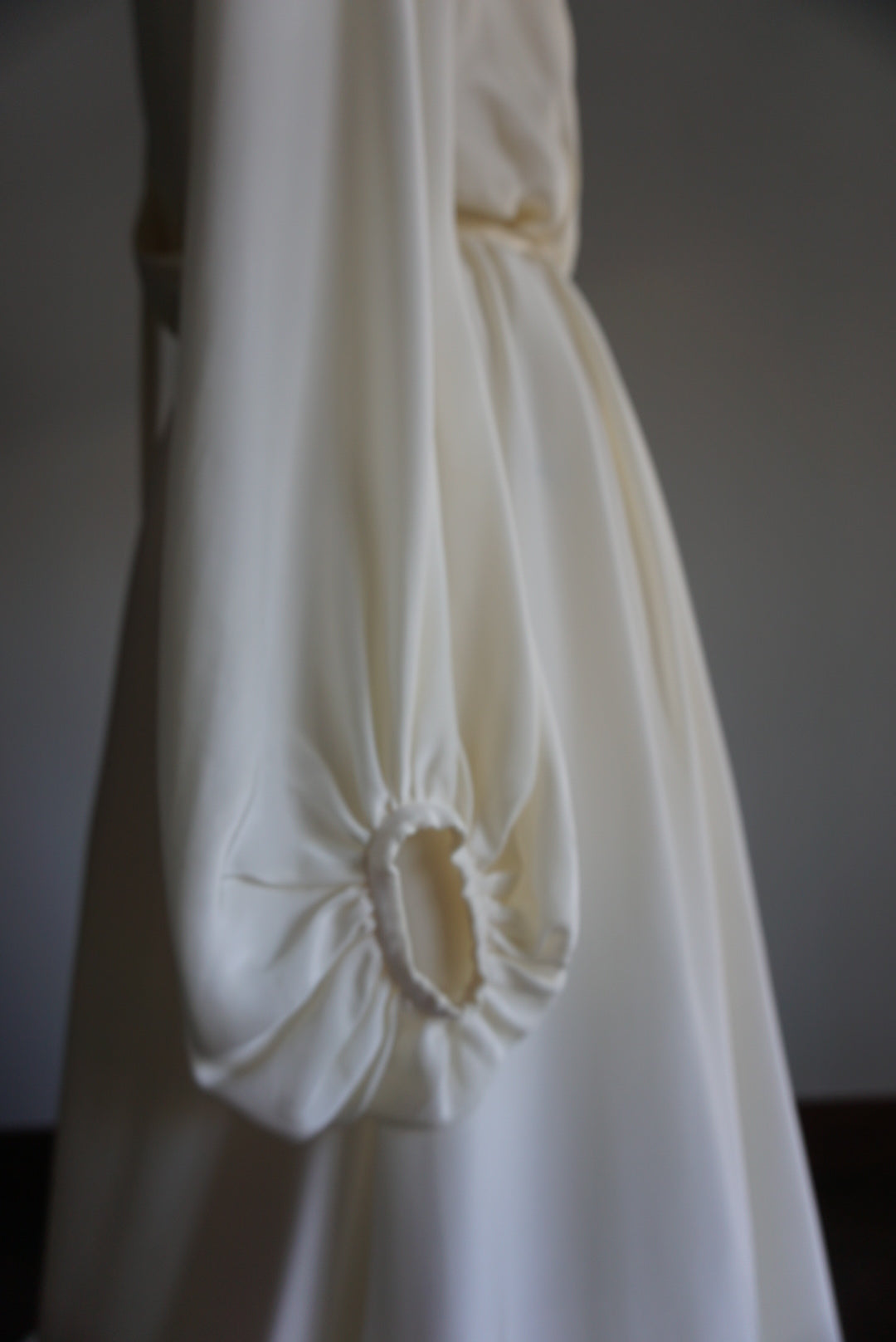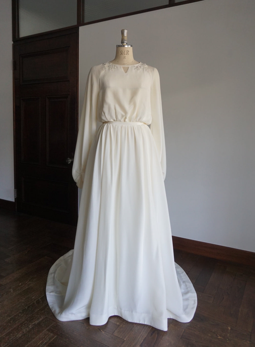 お袖や身頃にボリュームを持たせた柔らかさのあるデザインのドレスに仕上げました。
