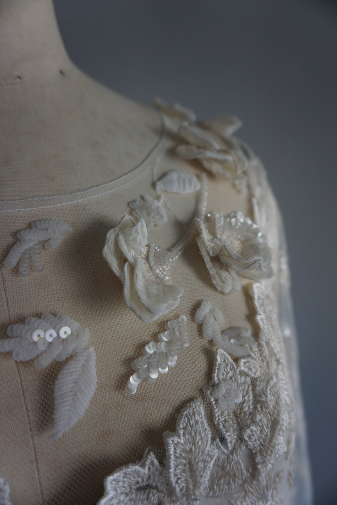 お袖と胸元は透け感を出し、身頃とのコントラストを付け、さらにスパンコールやビーズの刺繍を施しています。