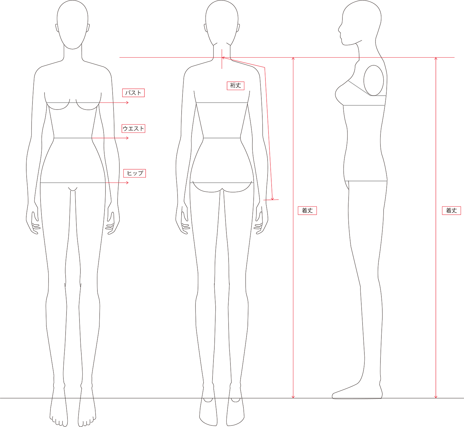 (ex.身長150cm/5cmのヒール→着丈を-10cmにしていただくとトルソー写真と同様程度の見え感になります)