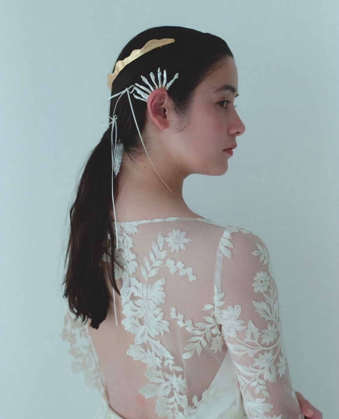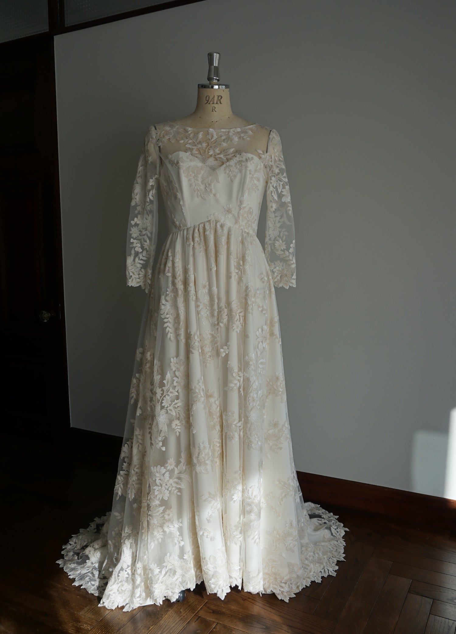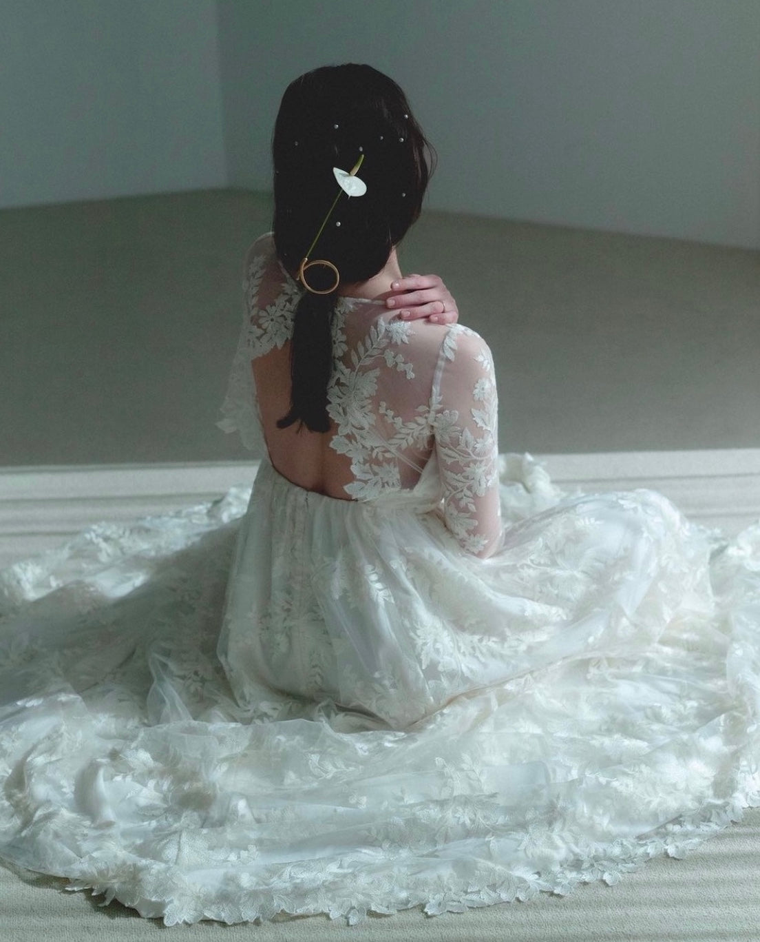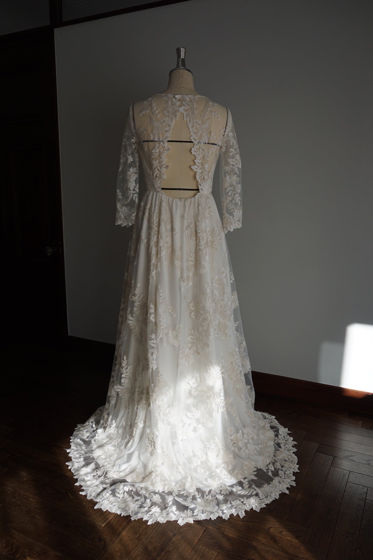 お背中はエレガントに開き、また袖口や裾にも施したレースのスカラップがまた上品かつ、少し色味のあるドレスなのでクラシックな雰囲気を醸し出しています。