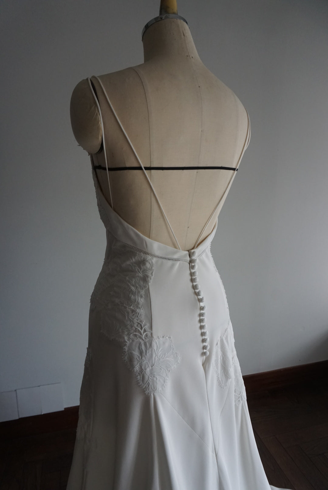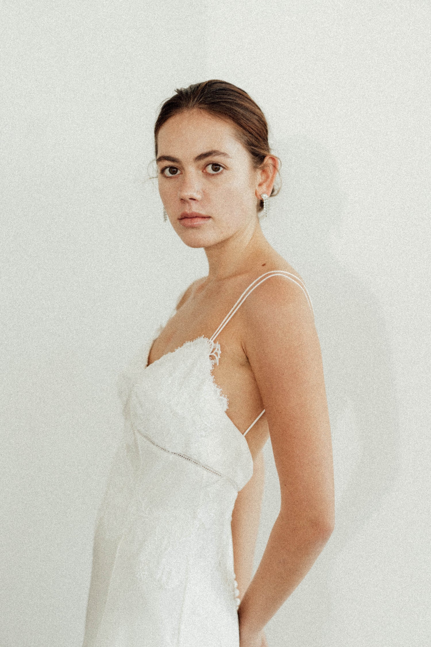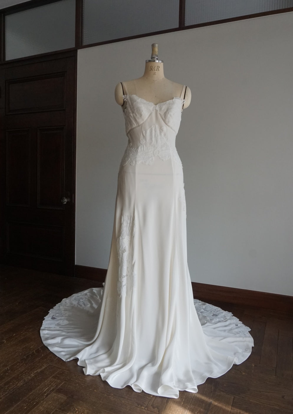 繊細なカットワークレースをあしらった、スレンダーなキャミソールドレス。流れるようなシルククレープで仕立てられ、歩くたびに生地がやわらかく揺れ、身体のラインをそっとなぞります。部分的に透けるレースから光が差し込み、静かな余韻を感じさせる表情を生み出します。背中に並ぶくるみボタンが、静寂の中にそっと意志を宿すように、控えめな存在感を添えています。