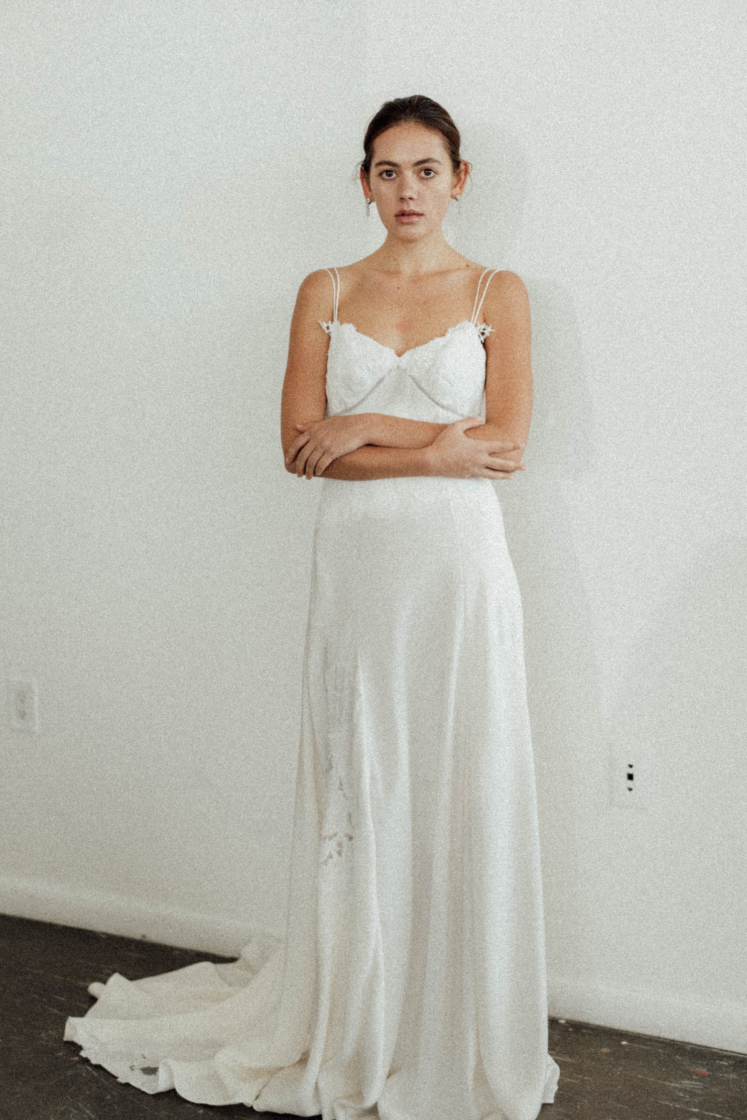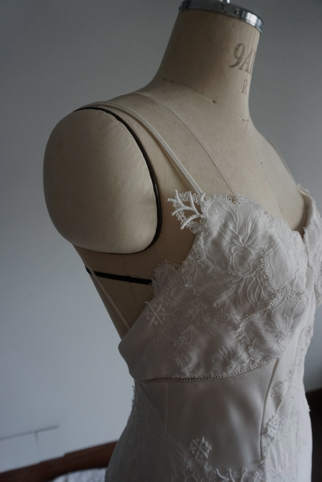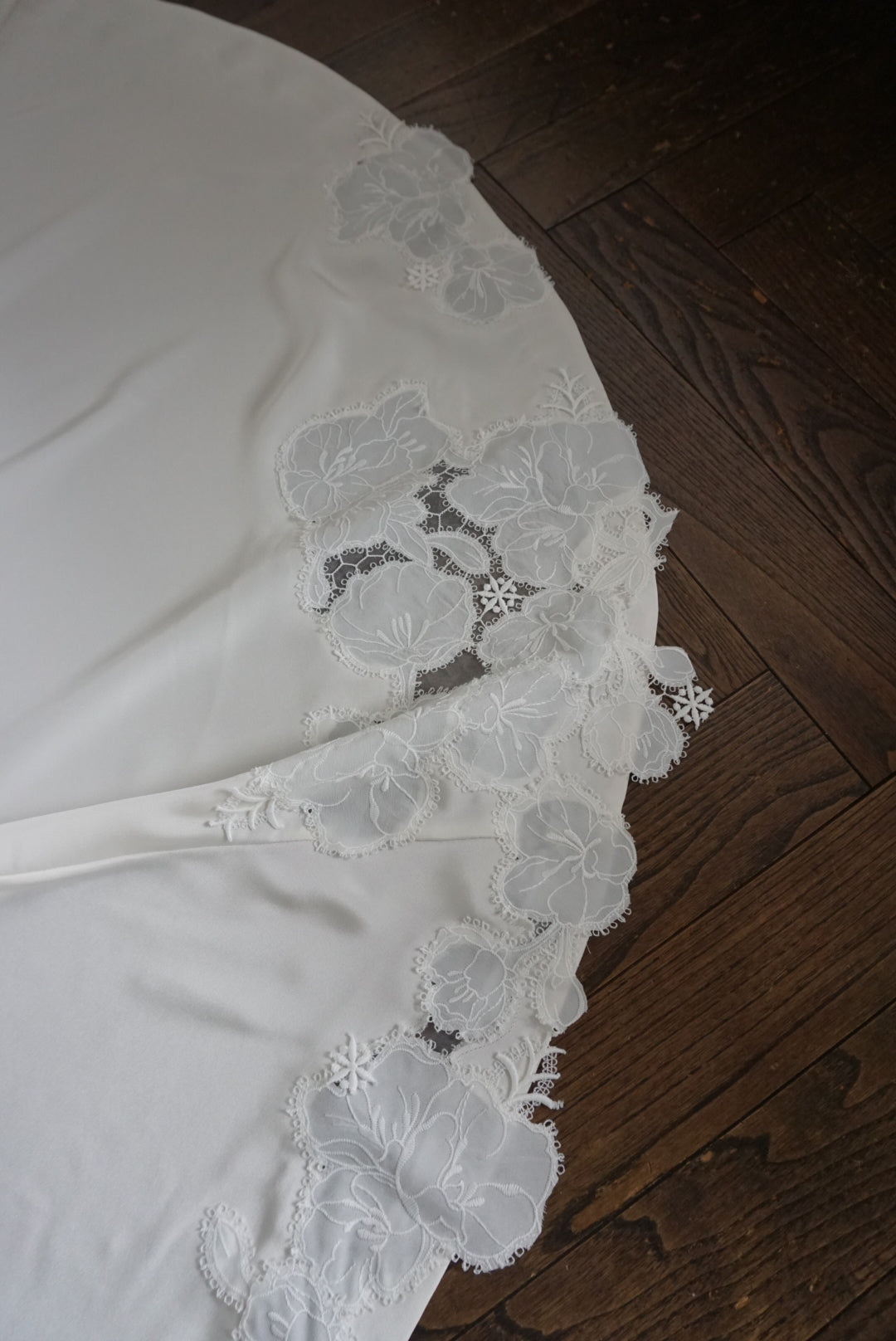 繊細なカットワークレースをあしらった、スレンダーなキャミソールドレス。流れるようなシルククレープで仕立てられ、歩くたびに生地がやわらかく揺れ、身体のラインをそっとなぞります。部分的に透けるレースから光が差し込み、静かな余韻を感じさせる表情を生み出します。背中に並ぶくるみボタンが、静寂の中にそっと意志を宿すように、控えめな存在感を添えています。