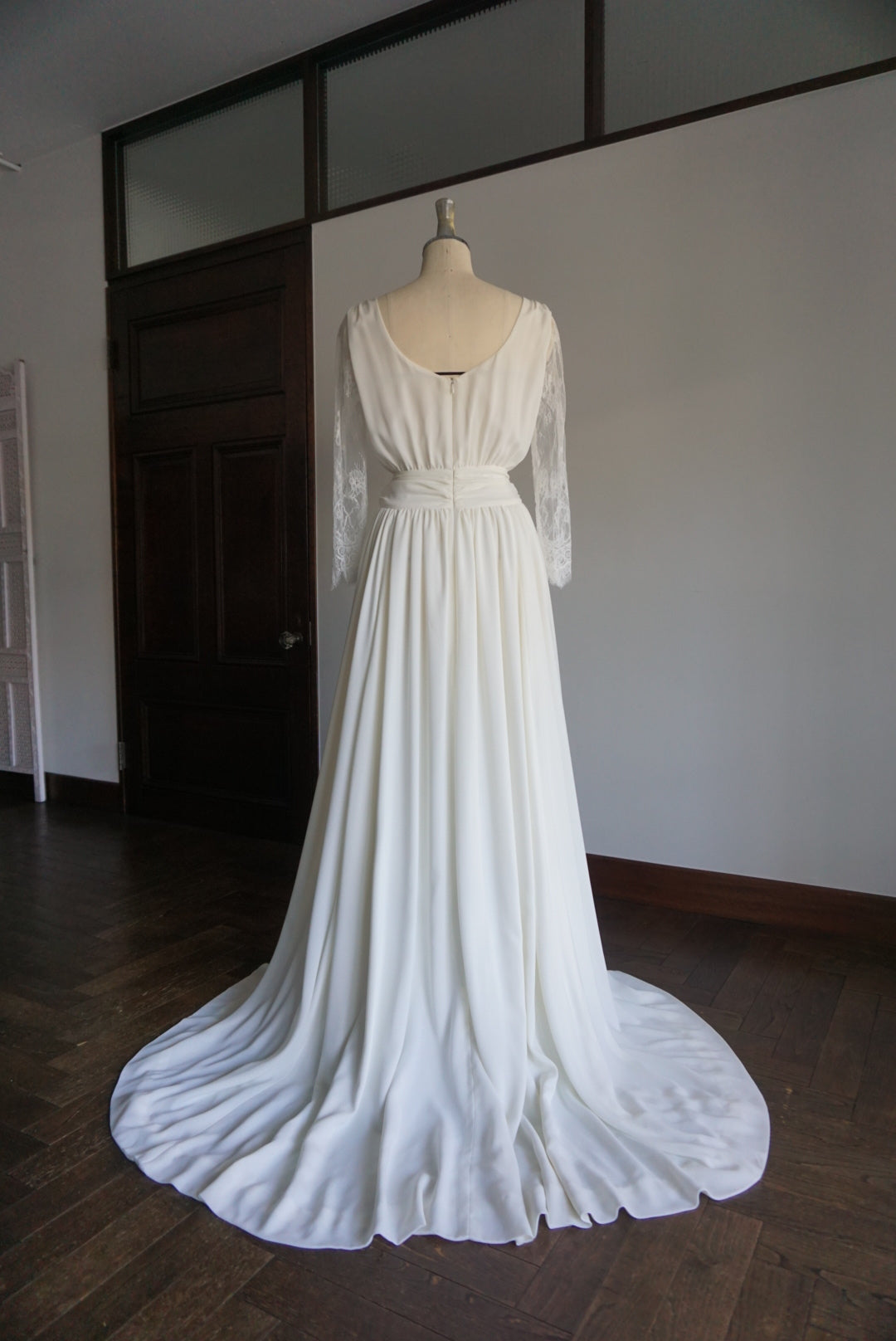 バックスタイルは程よくお背中を開け、裾に広がるトレーンもたっぷりとっています。